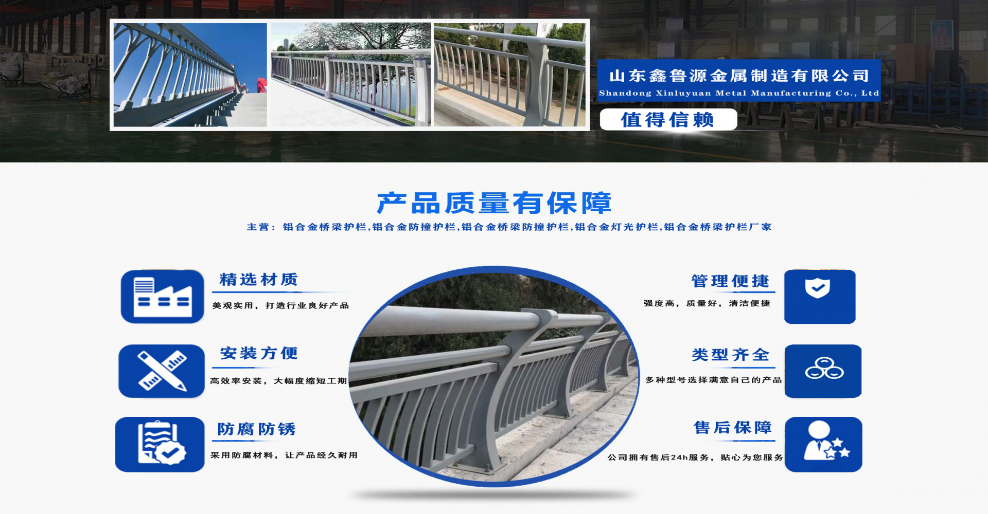 山東鑫魯源金屬制造有限公司主要經(jīng)營:鋁合金橋梁護欄,鋁合金防撞護欄,鋁合金橋梁防撞護欄,鋁合金燈光護欄,不鋁合金橋梁護欄廠家,環(huán)波梁橋梁護欄,環(huán)波梁防撞護欄。質(zhì)量可靠、經(jīng)濟實用的顯著特點。公司為客戶提供可靠售后保障,堅持“以品質(zhì)立足、服務求發(fā)展”,愿與各界朋友精誠合作、攜手發(fā)展! 服務優(yōu)勢:真誠的服務理念、完善的服務體系。公司專業(yè)力量充足;工程案例眾多、從業(yè)經(jīng)驗豐富;公司以可靠質(zhì)量的產(chǎn)品,合理的價格,完善的售后服務,能夠滿足市場各個企業(yè)的需求。 企業(yè)精神:執(zhí)著追求 持續(xù)創(chuàng)新執(zhí)著追求,就是堅持不懈、堅定從容,專注于自己的事業(yè),把能做的事情做好,不斷克服困難、把握機遇,贏得未來。 持續(xù)創(chuàng)新,就是生命不息、創(chuàng)新不止,通過持續(xù)實施技術創(chuàng)新、管理創(chuàng)新、市場創(chuàng)新,獲取持續(xù)的競爭優(yōu)勢。...